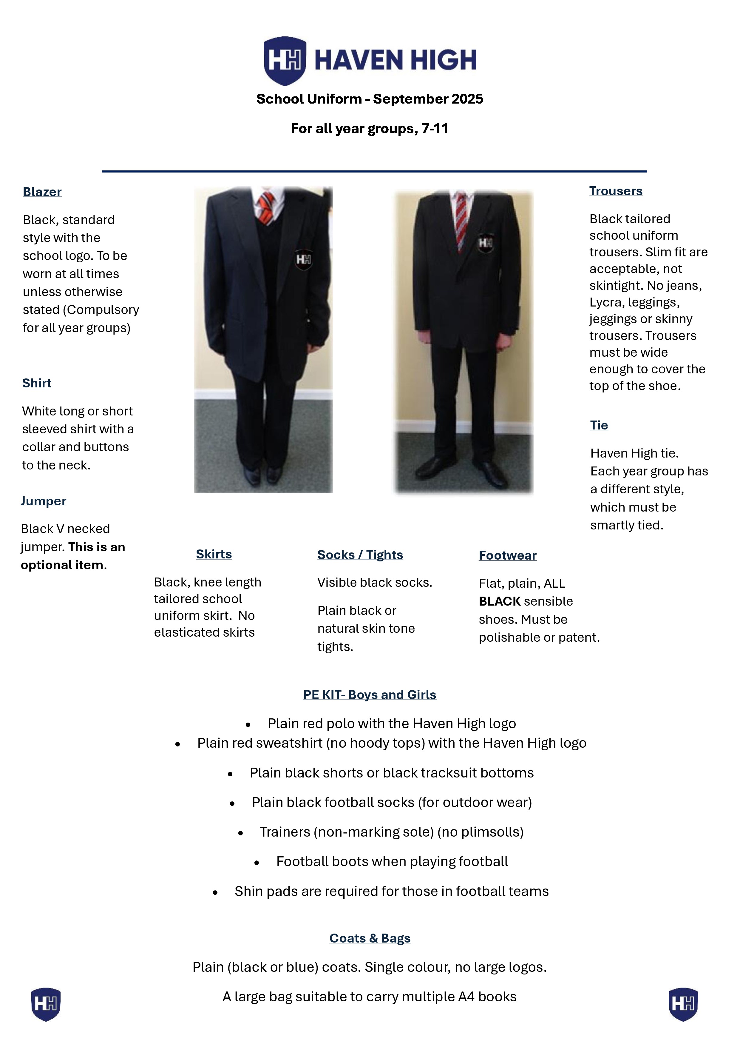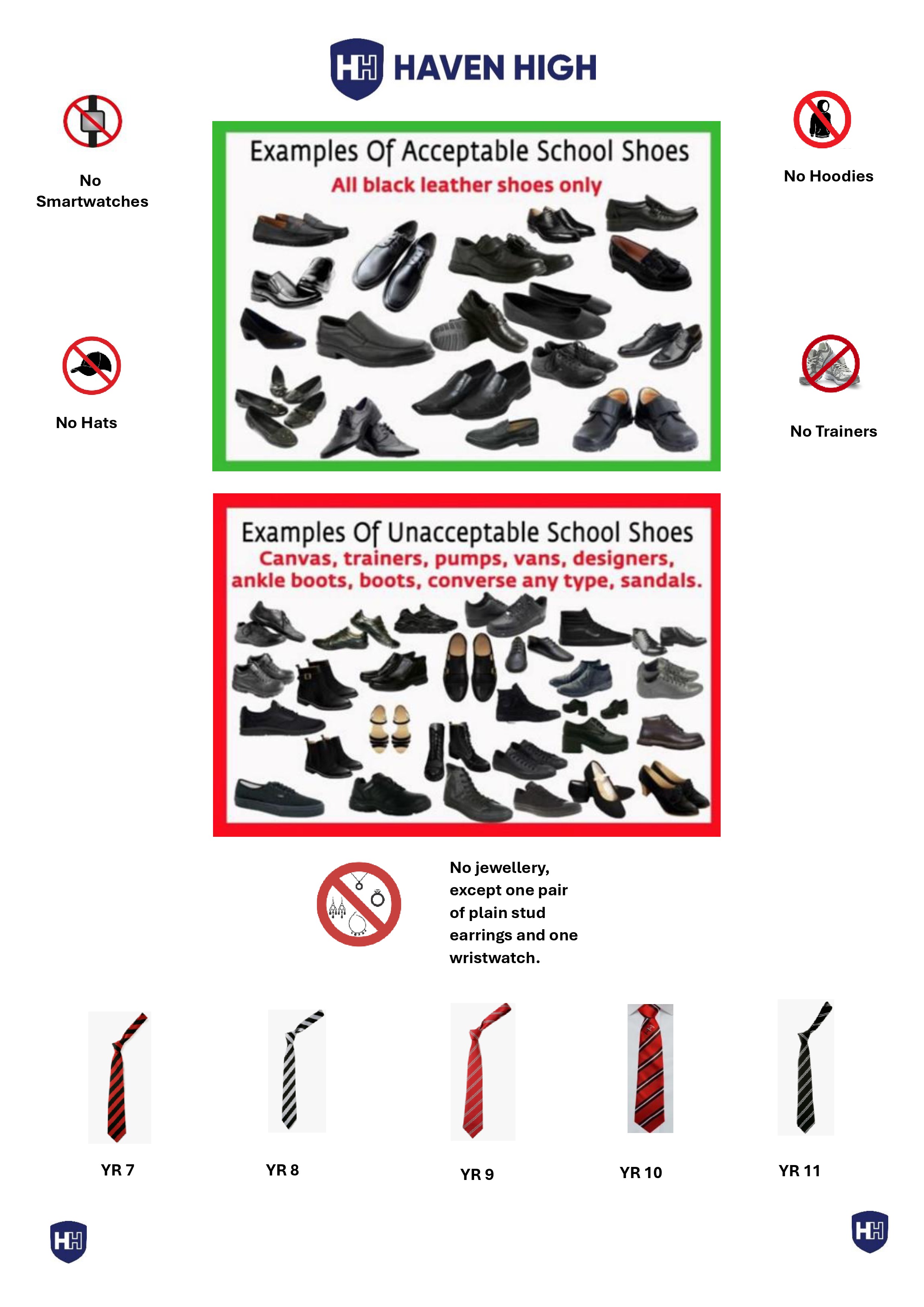 At Haven High Academy, we are mindful of the cost of uniform, and the pressures that teenagers feel as they mature. Therefore, we have tried to be flexible in our approach to ensure a sense of belonging and community as well as being cost effective and allowing our young people a sense of individuality. We are also mindful of the fact that we need to make sure that all students are kept safe, and this is the rationale behind decisions on jewellery, false nails and hoodies.